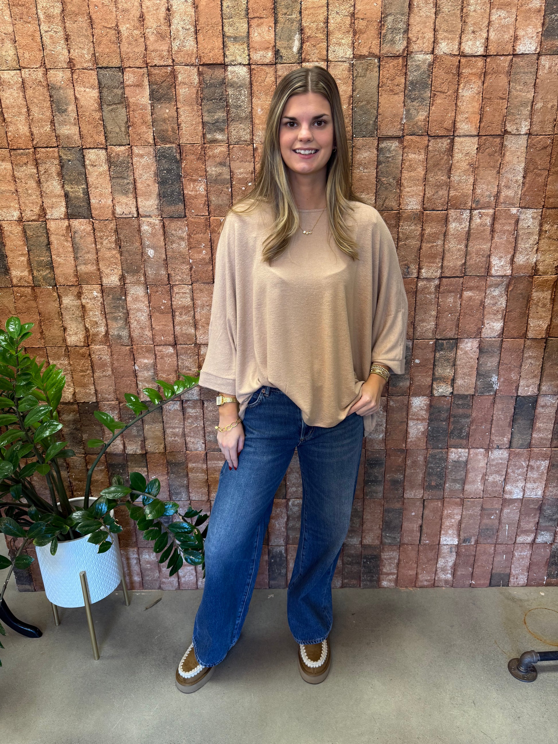 Dark taupe oversized knit top.