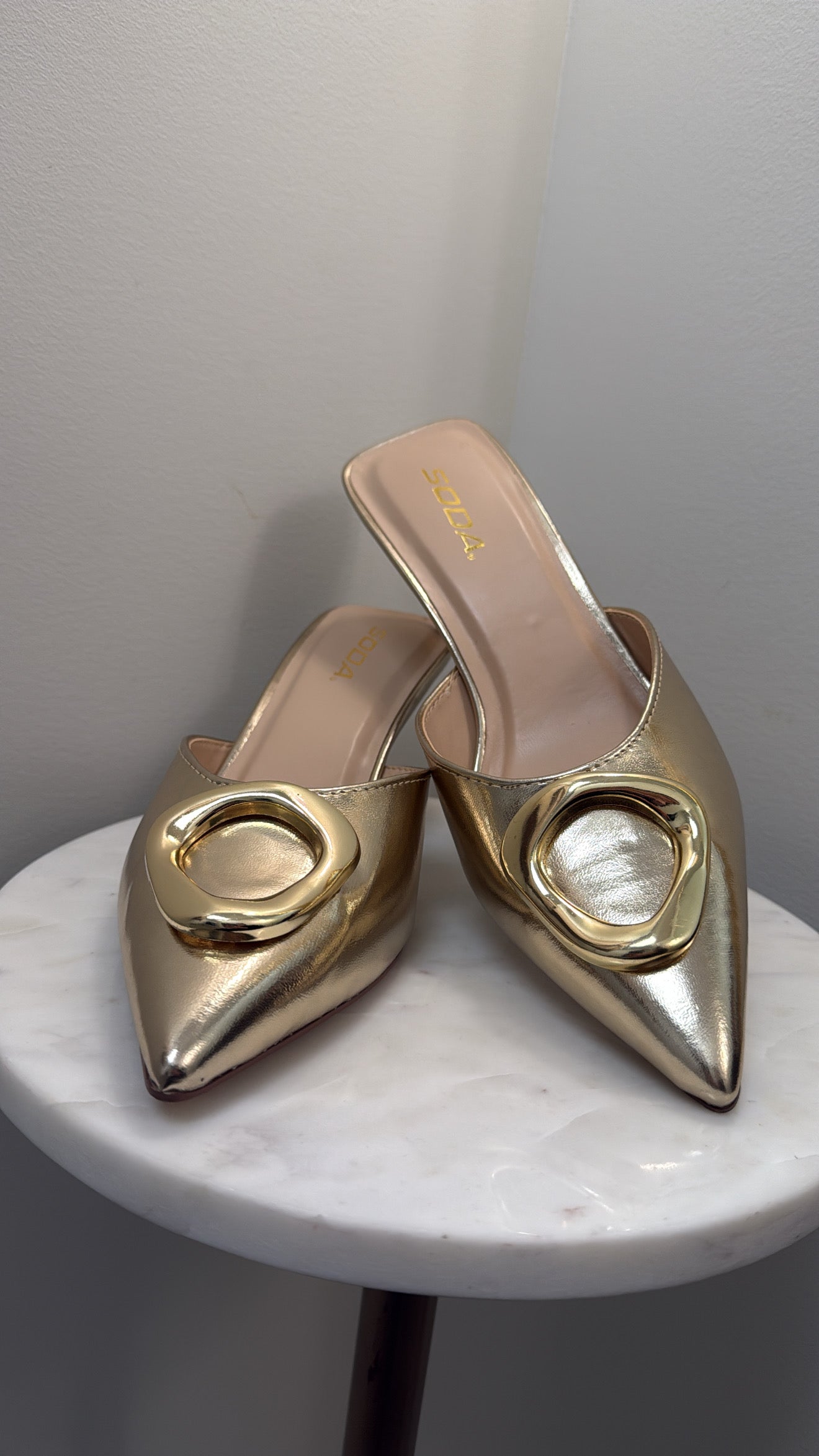 Wine or gold pointed toe kitten heel.