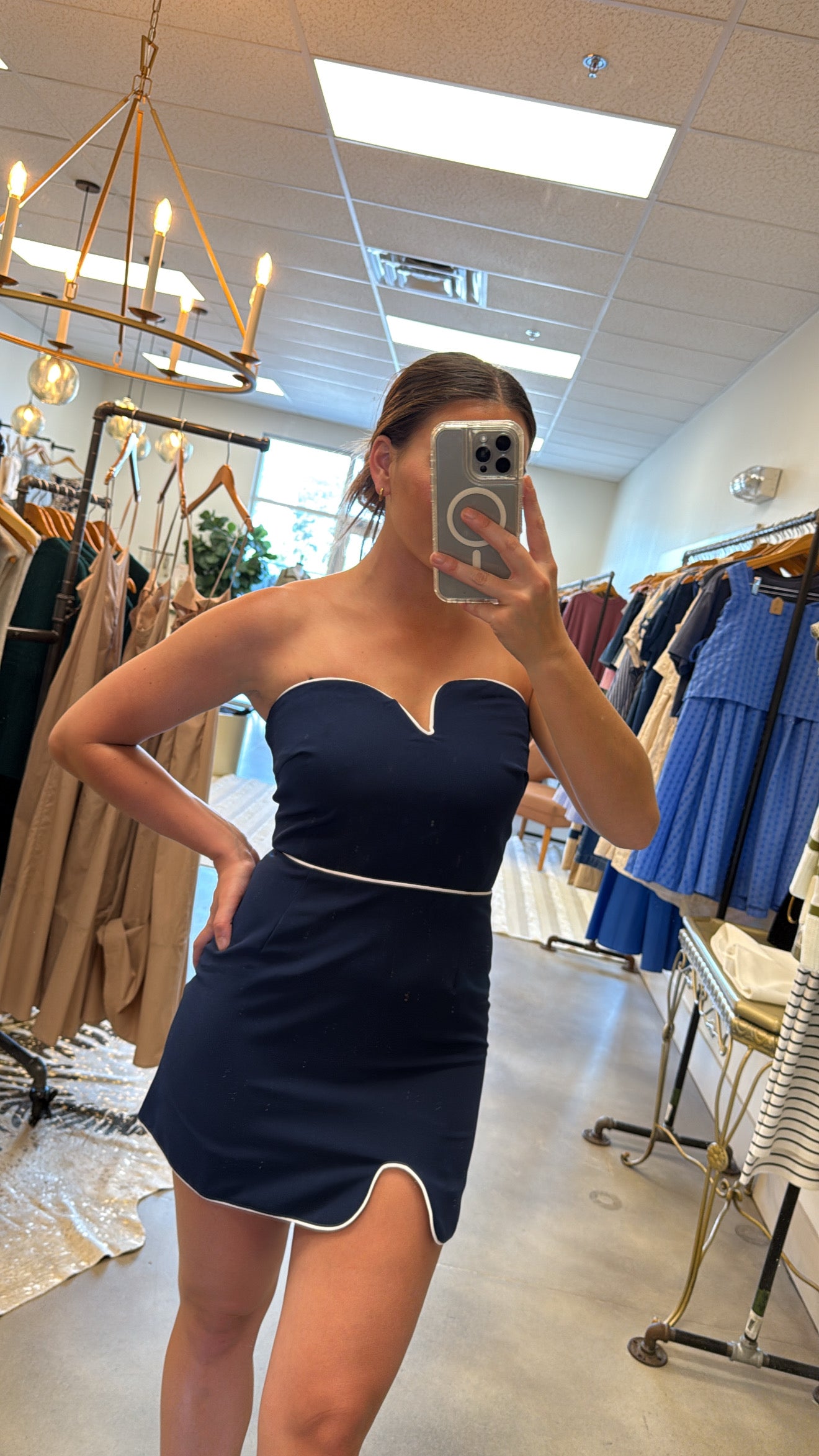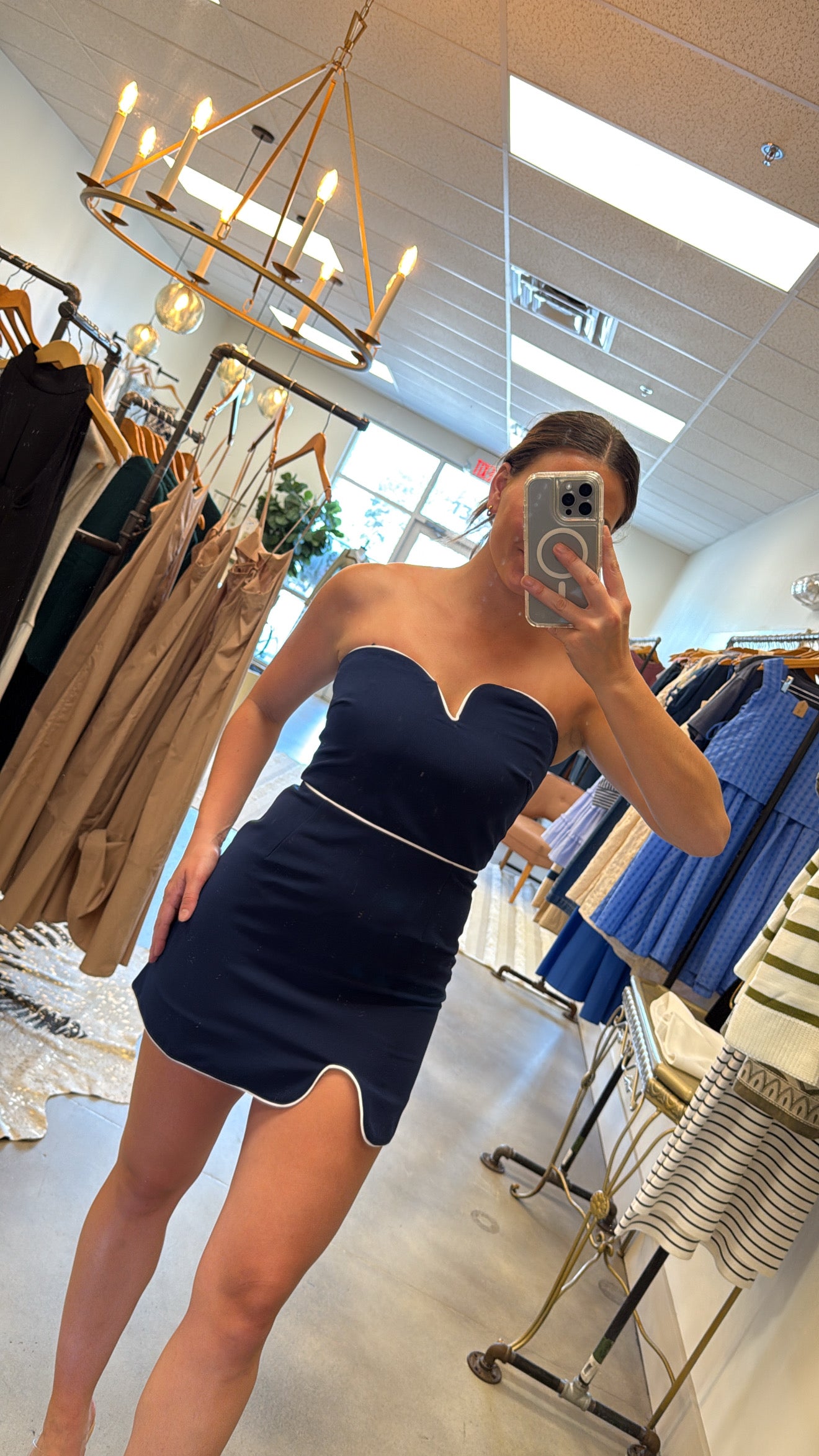 Navy/white contrast piping wavy strapless mini dress.