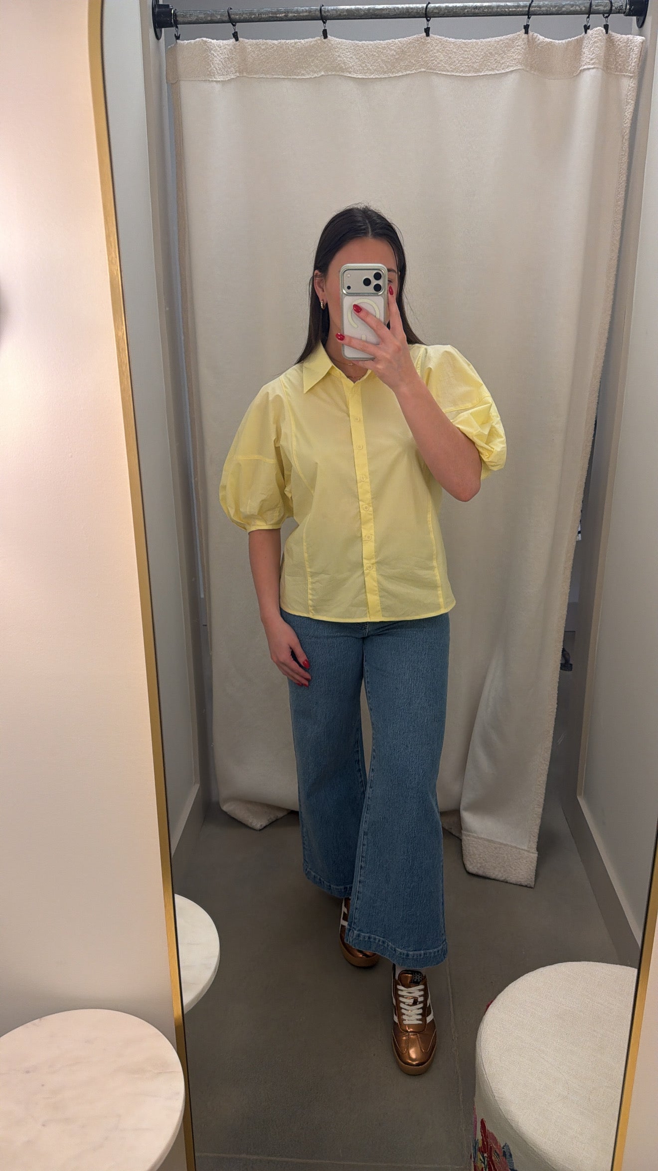 Yellow button down blouse top with balloon sleeve.