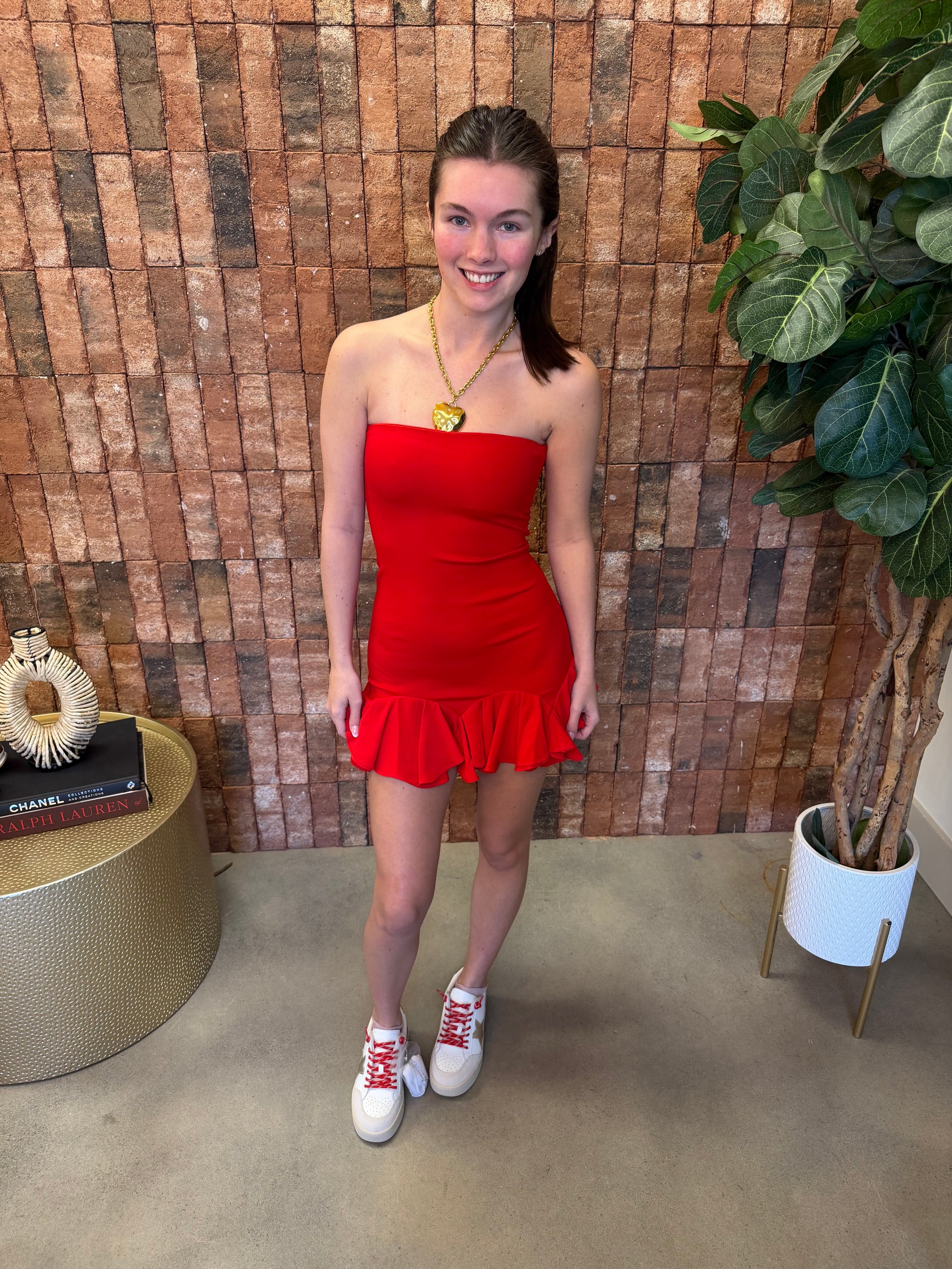 Red strapless mini dress.