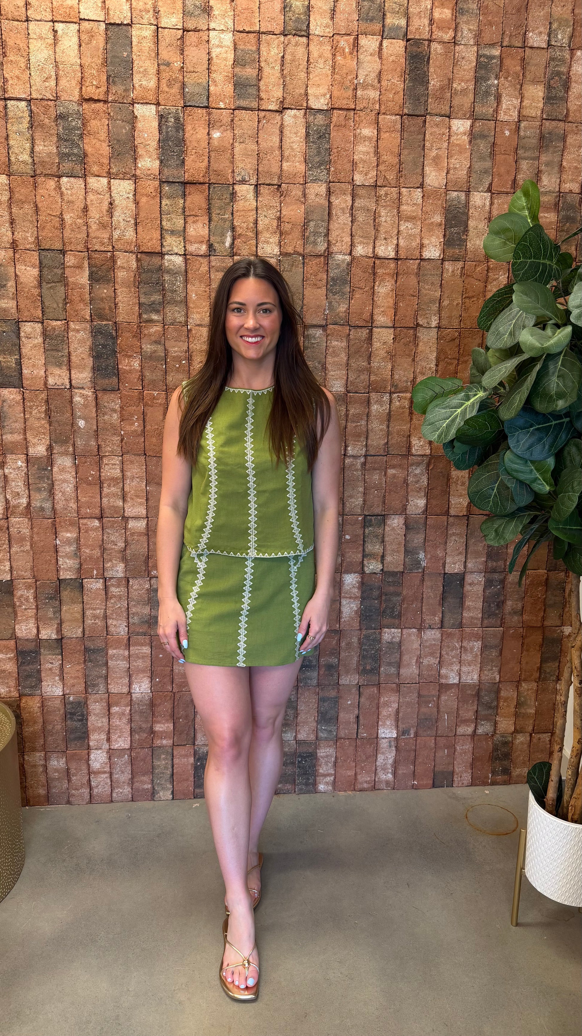 Green stitch detail skirt and top set.