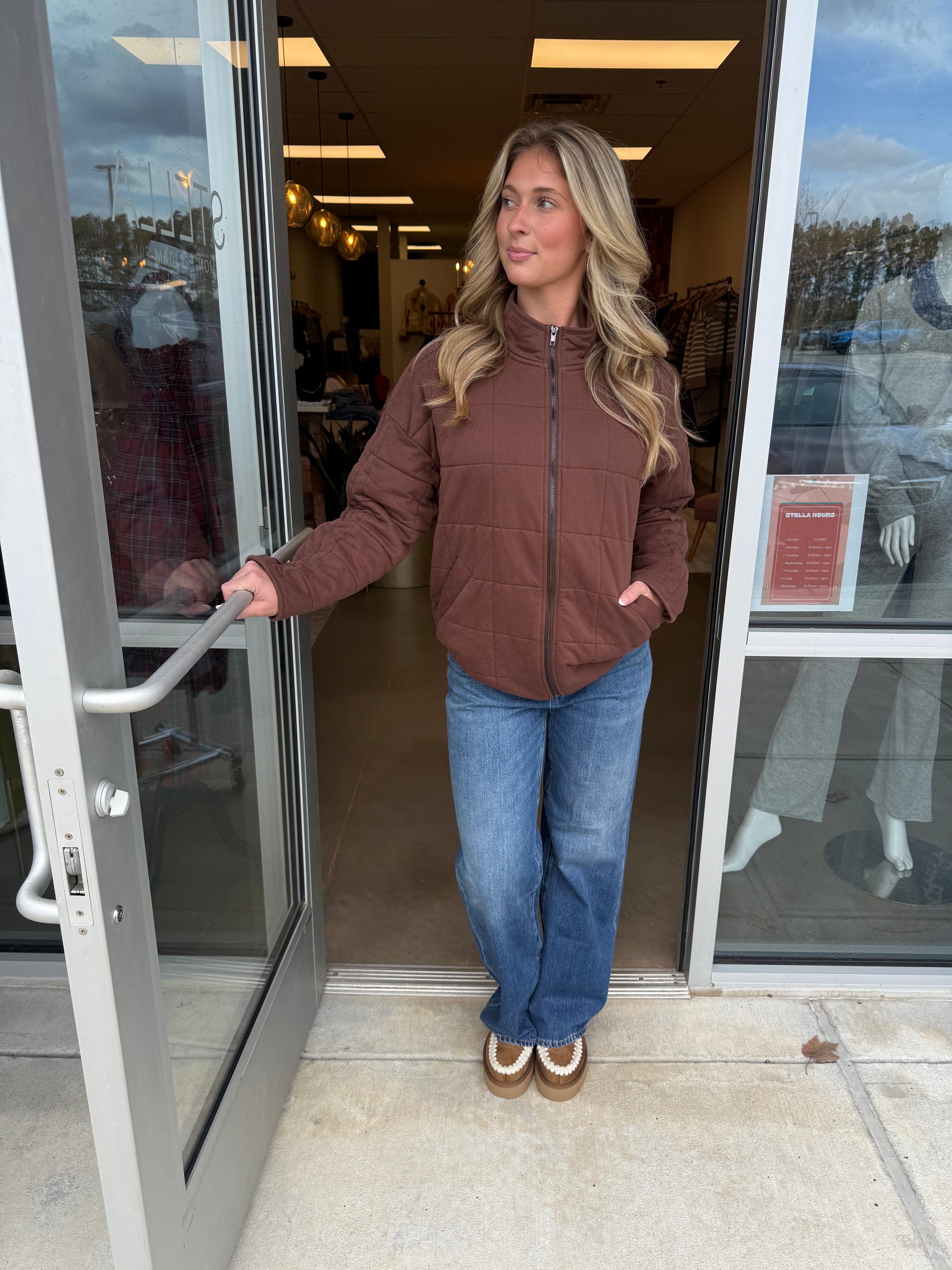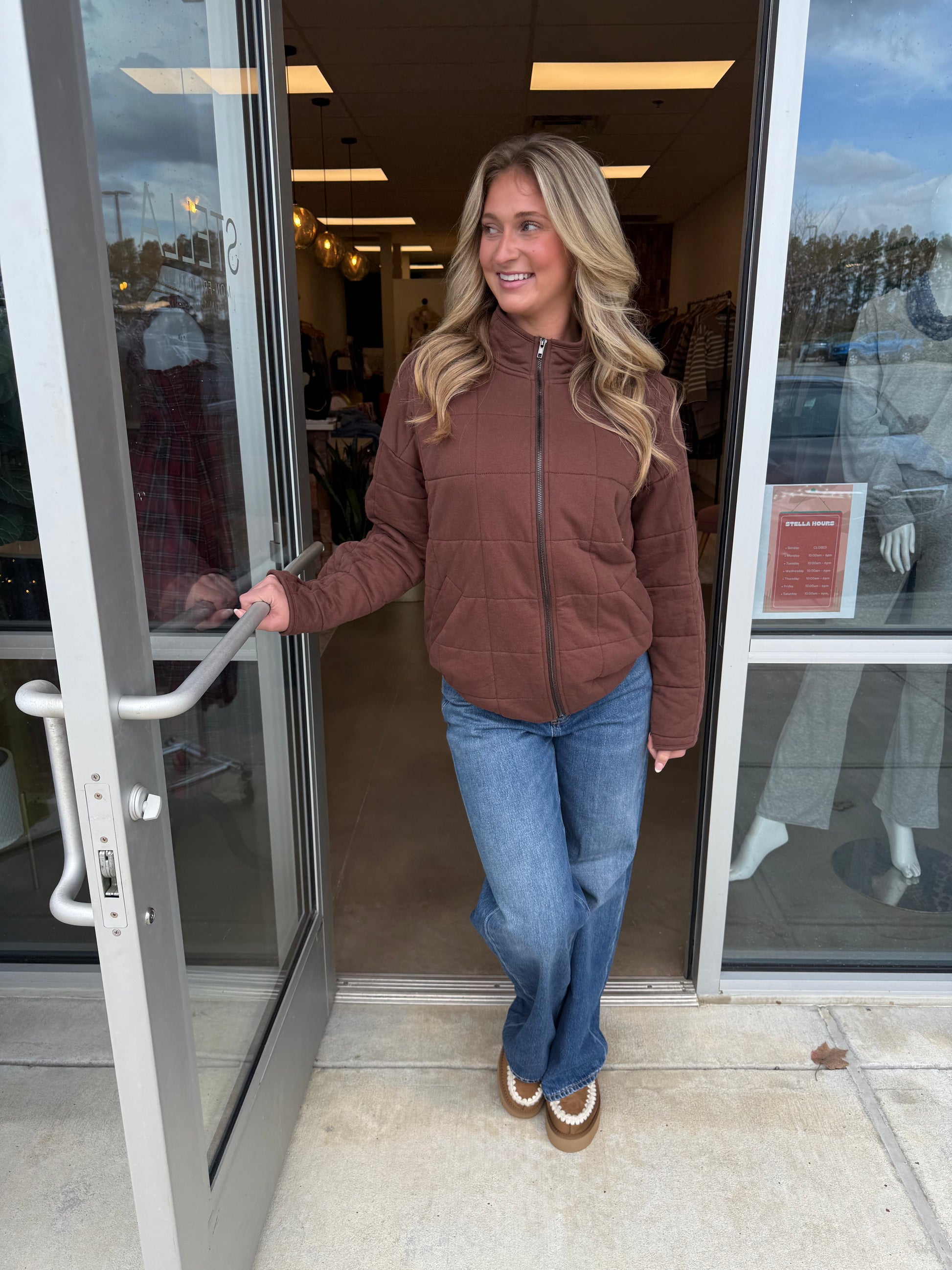 Chocolate quilted zip up jacket.
