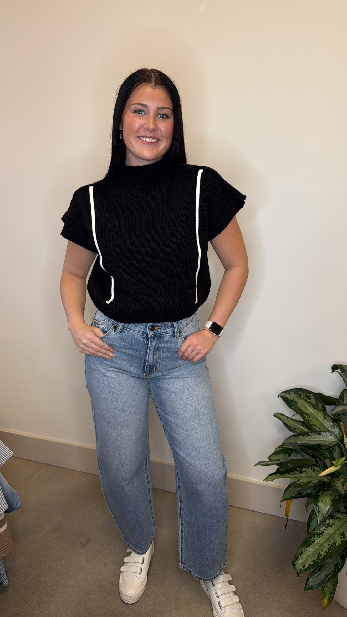 Black soft ribbed knit-contrast, white piping high mock neck sweater vest.
