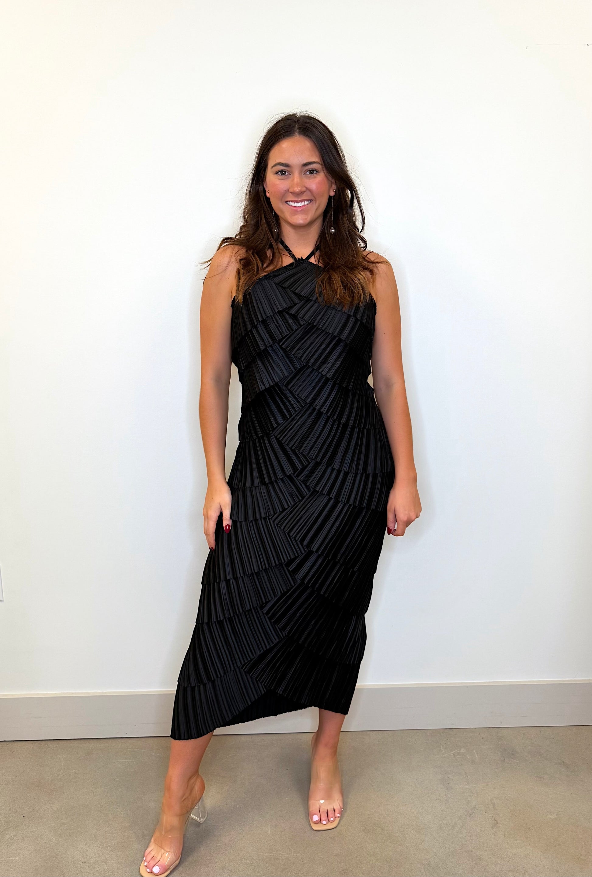 Black pleated satin tiered midi dress.