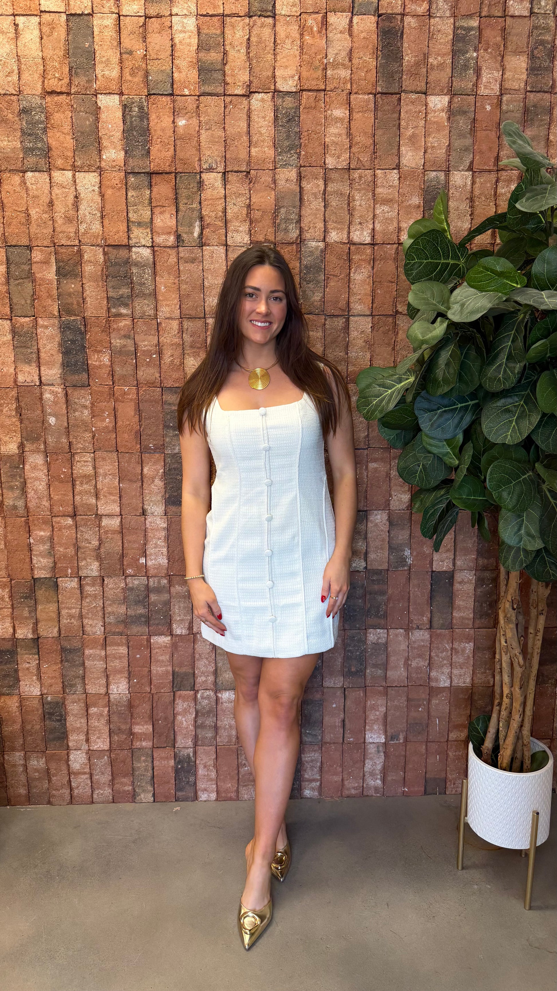 Ecru sleeveless Minnie dress featuring button-down detail